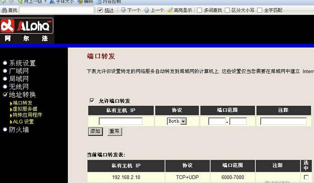 首先进入路由器的设置界面,由于每个路由器的设置界面都不相同,本文以阿尔法路由器为例说明。 找到端口转发设置选项,一般的路由器都是支持的。