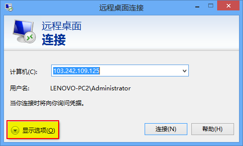 2、在”远程桌面连接”窗口右下角,点击”显示选项”。