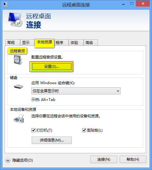 3、配置远程音频设置。本地资源 – 远程音频 – 设置。