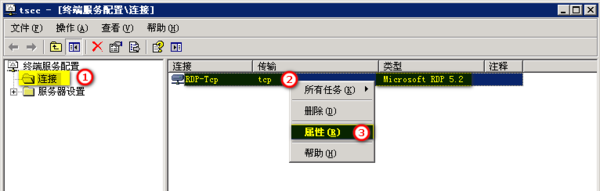 6、在“终端服务配置\连接”的窗口中,终端服务配置 – “RDP-Tcp” – 属性。