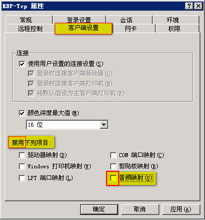 7、允许“音频映射”。步骤:“客户端设置”页签 - 禁用下列项目 – 去除“音频映射” – 应用 – 确定。