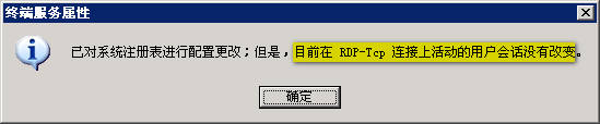 8、提示“已对系统注册表进行配置更改;但是,目前在RDP-Tcp连接上活动的用户会话没有改变”,所以,需要注销登录,重新再登录一次。