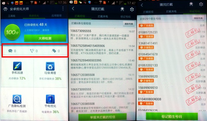 借助安卓优化大师精准拦截功能,可有效标记骚扰电话,对恶意骚扰电话还可拉入黑名单,还用户一个“清静”的手机应用环境。对骚扰李先生的这种情况,还怕那个无赖能打遍所有的公用电话吗?