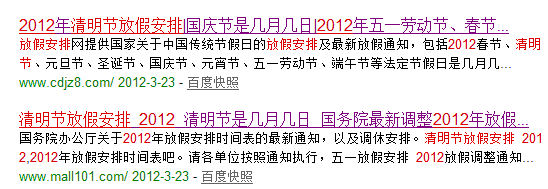 第四和第五是两个独立网站,所以出于笔者的爱好,点进去看了下(因为清明节这种放假安排,一般都是大门户内页或者政府网站公告占据前排,独立网站排名这么好,肯定是有SEO操作的。)