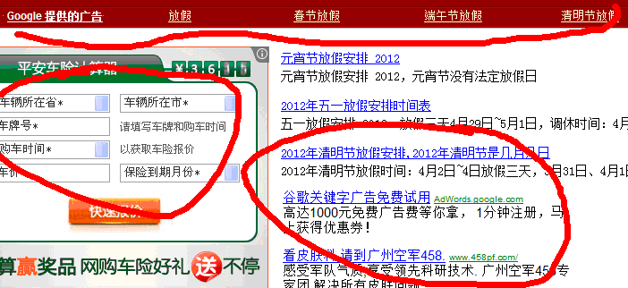 网站第一版大部分是广告,真正给用户看的内容就是那三条放假安排的文章链接。上面是谷歌联盟的文字广告,左边的百度联盟的图片广告,右边是谷歌经典 广告,三个广告中间夹着的就是用户搜索的内容了。可以看出谷歌文字广告匹配得非常精确,所以那段广告肯定也是点击率最高的,谷歌经典点击率第二,百度图片 第三,另外网站还有两次弹窗。