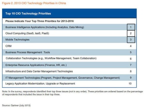 根据Gartner最新报告,2013-2016年中国CIO最关注的三大技术应用依次是:商业智能、云计算和移动技术,未来三年中国企业将在这三个领域加大投入。