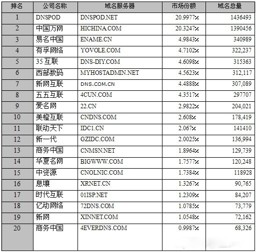 从以上图表统计数据显示,上周占据中国域名机构排行榜前20名的分别是:DNSPOD、中国万网、易名中国、有孚网络、35互联、西部数码、新网互联、五五互联、爱名网、美橙互联、联动天下、新一代、商务中国、华夏名网、中资源、息壤、时代互联、亿动网络、新网、商务中国。