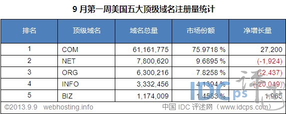 (图3)美国五大顶级域名注册量统计排名(截至2013-9-9)