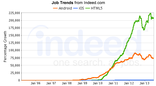 企业显然愿意支付更多的薪水来留住人才,让他们帮助弄清数据的价值。他们同样也愿意给Apple相关开发者开更多的薪水:在Dice的调查中,Omnigraffle与Objective-C都出现在排行的Top10。而从Indeed.com的最热趋势分析中,我们能看出一些更有意思的东西:除下大数据之外的热门技术,5个移动技能也位列Top 10——HTML5、iOS、Android、mobile app、jQuery,其中只有一个与Apple相关。
