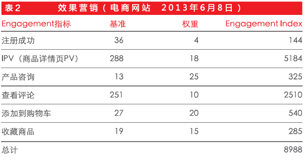 为了后面的计算关系,我们把每个Engagement指标都变成1为基准,我们可以得到一系列比例关系, 有了这个对应关系,我们可以很容易地给转化发生之前的所有重要事件定义Engagement的权重。如果我们以1个转化为100分计算,按照各个不同行为的实际值,计算出各指标的Engagement Index完全轻而易举(表2)。