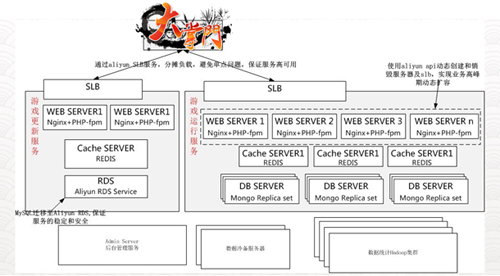2、在关键路径上,部署主备集群,通过负载均衡服务SLB分发并对外提供服务,避免单点故障带来的游戏不可用。游戏更新和运行服务均体现了这一点。