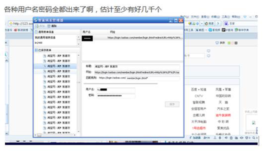 搜狗浏览器智能填表功能里保存大量网站密码,涉及淘宝、微博等大量用户: