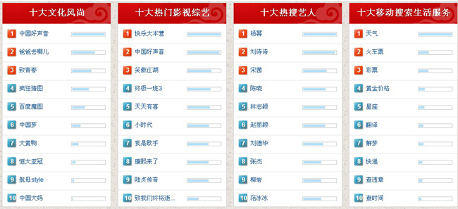 百度2013年搜索风云榜包括8个主榜单和16个特色榜单,其中主榜单囊括2013十大搜索热词、十大上升最快事件、十大话题人物、十大网络流行语、十大文化风尚、十大热门影视综艺、十大热搜艺人、十大移动搜索生活服务。