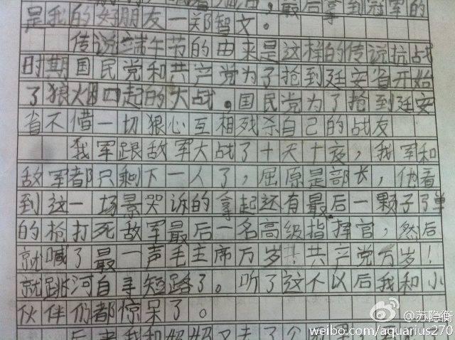 出处:2013年6月,一段讲述端午节由来的小学作文内容截图在微博网友中热传。这篇文章,最早由新浪微博网友“苏隐衡”发表于2011年11月14日。援引其中的一句话“我和小伙伴们都惊呆了”被作为网络流行语迅速传播,短时间内成为了热门话题。