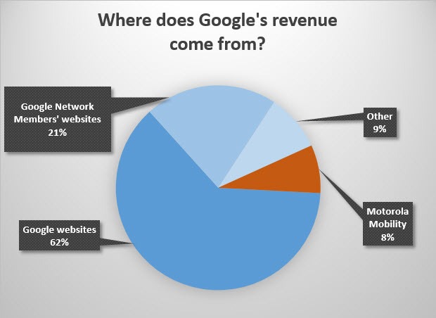 两年前,谷歌还是一个偏科生。当时它的收入几乎全部来自广告。其2011年的报告里写,“2009年我们收入的97%来自广告,2010与2011年则有96%来自广告。”随着谷歌收购摩托罗拉移动,谷歌试图进入硬件领域,你可以看到它的收入结构有了些微的变化。不过最近它把这块业务卖给了联想,可能其收入结构又要回到当初。“其他”(Other)类别里,主要是包括其数字内容与非摩托的硬件产品,这块仍占公司收入的很少一部分。所以摩托罗拉移动售出后,谷歌的广告收入又要回归到占比90%以上的地位。