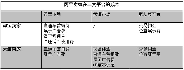 C2C业务,即淘宝,收入主要来自于卖家的营销费用;B2C业务中,天猫主要靠交易额佣金收钱,而聚划算的收入主要来自卖家的展示广告位置费。下图中可以清楚的看出,淘宝和天猫卖家在阿里不同平台上做生意,都需要支出哪些成本: