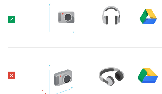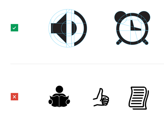 以下是谷歌产品图标的一些设计原则,分别列出正确的设计和错误的设计: