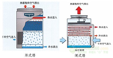 冷却水通过盘管间接接触,水槽内的水喷淋在盘管上蒸发(潜热)带走热量。