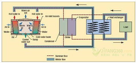 提示:冬季时闭式冷却塔作为干冷器(风冷)时,可以不喷淋水。这种工况时闭式冷却塔的散热量很小,在数据中心不是很实用,其他工业行业有使用。