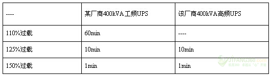 第一,过载能力强,抗负载冲击能力强。过载能力是IEC62040-3中要求标称的关键指标之一,其强弱可通过实际数据来衡量。表-1所示为同一厂商的工频机与高频机过载能力,由表-1可知,两类机型过载能力并没有区别。