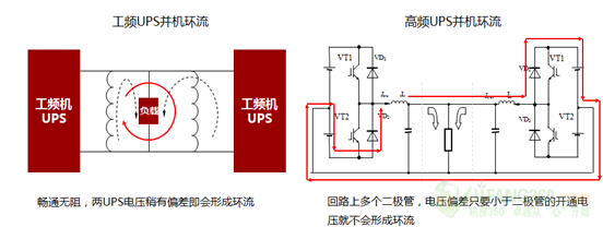 实际上,变压器的设计反而增大了环流的风险。图-3所示为两类机型的环流路径。工频机UPS的并联就是变压器的直接并联,整条回路上没有器件限制,电压的偏差很容易产生环流。而高频机的环流路径上具备多个二极管,小于2V的电压差根本形不成环流。