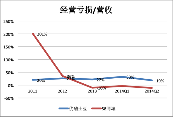 从2011年算起,到2014年上半年,58同城、优酷土豆累计亏损分别为9100万美元、2.84亿美元,它们每亏损1美元换来的市值分别为37美元和15美元。