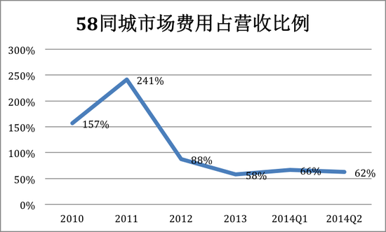 巨额的广告投放,数千人的线下业务员团队使58同城市场费用占营收的比例居高不下。2011年市场费用突破1亿美元,相当于营收的241%,此后有所回落。2013年及2014年前六个月,基本稳定在营收的60%左右。