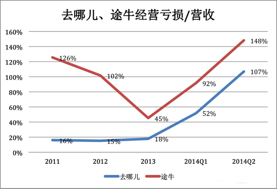 2013年,去哪儿经营亏损增速为营收增速的22.3%。2014年情况迅速恶化,二季度营收环比增长19%,经营亏损增加了146%几乎是营收增速的4倍! 途牛的情况更糟,今年二季度营收增长9%,经营亏损增加77%,为营收增长的8.6倍!