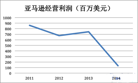 亚马逊以利润换市场不假。营收从2011年的481亿美元增到2014年上半年的391亿美元。同期,经营利润从8.6亿美元降至1.3亿美元。