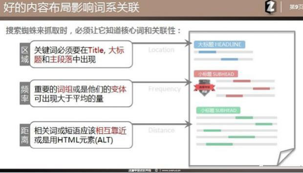 方法(3)距离产生美在SEO世界是不适用的。词、短语、还是语句都应该尽量的放近在一起,或是使用HTML元素(比如图片ALT设置)。所以为了提升语境关联,应该把内容通过段落,列表,分区做的更加明显,一看就知道这个段落是说什么。前后句子之间是否有联通性,不要把意思相近的内容分开的太远。因为你不能保证蜘蛛会把全文统抓。