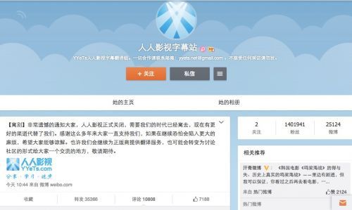 2014年12月20日上午,人人影视官方微博发布了一条消息称,人人影视正式关闭,未来或继续为正版商提供翻译服务,也可能会转变为讨论社区。人人影视陪伴了我们多年,关于人人影视,你应该知道这8件事
