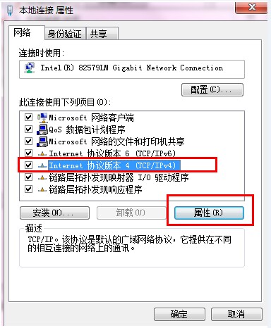 5.选中“Internet协议版本4(TCP/IPv4)”选项,然后单击“属性”。