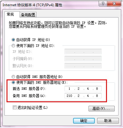 6.点击单选按钮“使用下面的DNS服务器地址:”,在首选DNS服务器和备用DNS服务器中输入SDNS的地址:“1.2.4.8”与“210.2.4.8”。