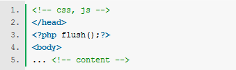 用户端发送浏览请求后,服务器端一般要花销200-500ms去处理这些请求,在此期间,用户端浏览器处于等待状态,如果要减少用户等待时间,可以在适当的位置使用flush,将已经就绪的内容推送到用户端,这在php中很容易实现例如:
