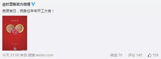 用杜杜做了一个羊头的造型,开工大吉,简单直接,恶搞元素是杜杜一贯作风,文案上没能发挥极致,此条略显平淡。