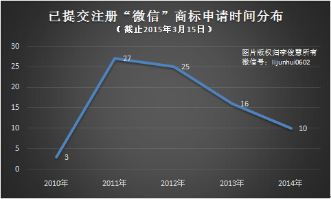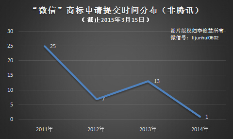 从申请时间来看,非腾讯公司提交的“微信”商标注册申请,集中发生在两个年份2011年和2013年。简单说,在微信面世第一个年头,微信在腾讯内部的地位处于由“边缘向核心”过渡阶段,腾讯自身并未在此阶段启动“微信”商标周边类别或跨类别保护注册。但是,微信的用户,显然比腾讯更敏锐,一些公司或个人在此期间陆续提交了25件“微信”商标申请。
