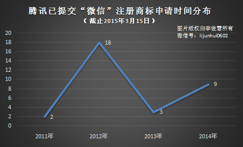 腾讯2011年1月最早提交的商标注册申请仅涉及两个类别,即计算机相关(9类)和电视相关(38类)。腾讯开始大量注册外围或周边应用等商品或服务类别,加固“微信”商标防火墙的时间发生在2012年。当年腾讯一口气新提交了18件“微信”图文商标申请,并于当年的6月27日、28日、29日三天集中完成注册申请提交。