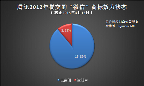 从商标效力状态看,截止2015年3月15日,腾讯2012年提交的18件“微信”注册商标,已有16件完成注册,另有2件依旧处于“注册中”状态,分别为38类和43类。