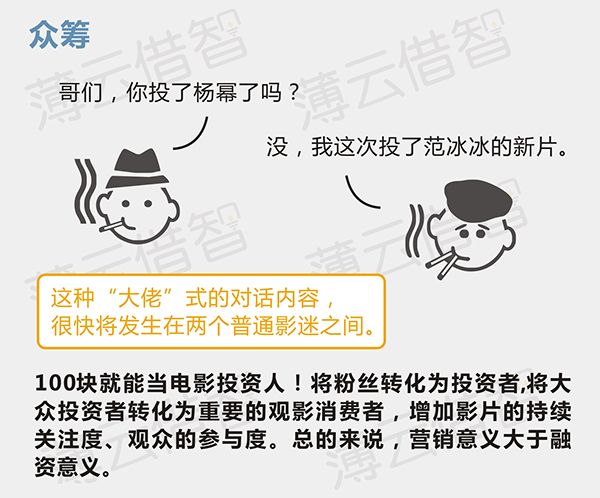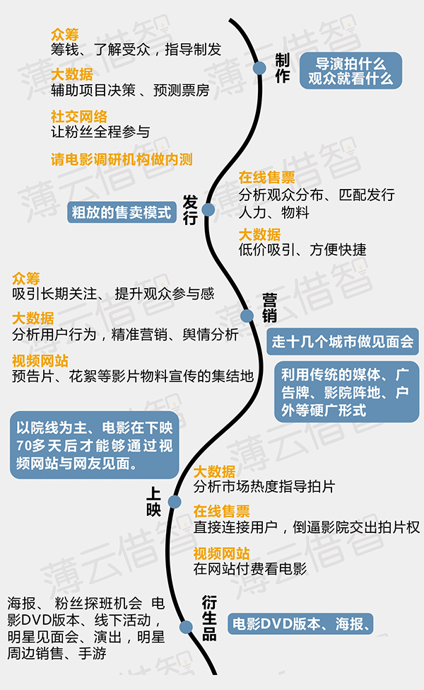 纵观当下的电影产业链,当中有三个关键点:渠道、制片方和影院。渠道需要优质的内容,制片方需要更好的营销和影片曝光,影院需要更多的观众。用互联网思维做电影,利用互联网产品和模式,来运作包含制作、发行、放映以及相关衍生物在内的整套流程已是行业未来的发展方向。