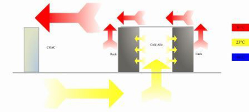 机柜排成面对面、背对背方式摆放形成冷热通道布局,在机柜的冷通道侧设置足够的、通风率较大的开孔通风地板,并可根据不同位置的热负荷大小调节地板通风率,或修正通风地板位置。在机柜的热通道侧,不设置通风地板。