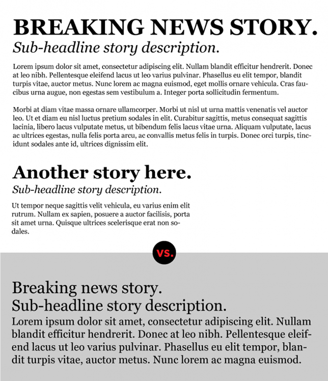 有时候你需要强化某个部分,会在视觉上进行强调,让它从整个设计中脱颖而出。文字部分常见的手法很多,斜体、粗体、下划线、大写、增大字体大小,等等。但是千万不要将所有的强调方式都用在同一篇文字同一个段落中,这样会让它看起来凌乱不堪。