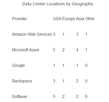 Azure以12个区域领先,接着是Softlayer的9个,Amazon8个,Rackspace6个。Google比较落后,只有3个。