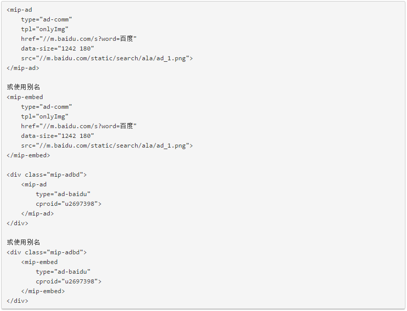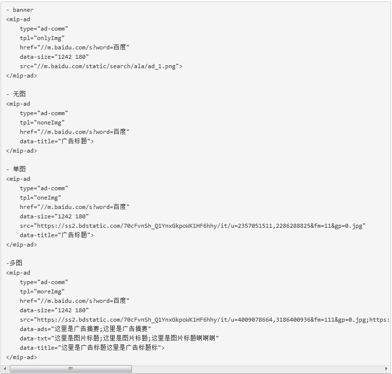 mip-ad 用来支持站长添加网页内自定义广告,主要包括连接、图文,多图,banner四种形式,这类广告可以制定大小也可以被用户关闭。
