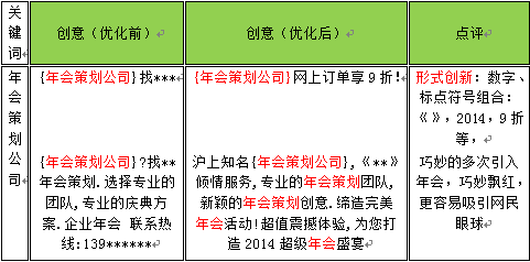 1. 创意撰写水平:创意围绕关键词撰写得越通顺、越有吸引力,则越好。这里客户容易进入误区,认为创意是越多越好,其实不是。当客户的账户结构搭建健康(如何搭建健康账户—参考:http://www.enkj.com/idcnews/Article/20161212/11178),创意建议一长一短两条就足够了。关键要写的有新意,能吸引网民。这里建议仅供参考。