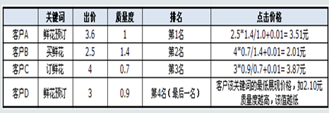 由质量度*出价决定,推广结果的排名顺序依次为客户A、客户B、客户C、客户D的相应关键词。根据以上计算方法,每个关键词的点击价格分别如下:
