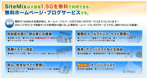 SiteMix是一家日本免费空间服务网站,1.5G存储空间,支持PHP,提供免费二级域名1个或绑定1个你自己的域名(仅支持顶级域名,二级域名不可以),FTP、Web方式上传管理文件。