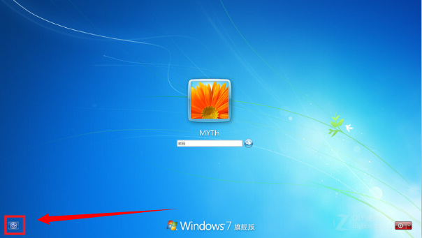 其次,关机进入Win7系统,在输入密码的界面,点击左下角的工具按钮。