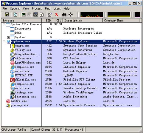 Process Explorer是一款免费的进程监视工具,功能比Windows自带的任务管理器要强大的多,不仅可以监视、暂停、终止进程,还可以查看进程调用的DLL文件,是预防病毒、查杀木马的好帮手。