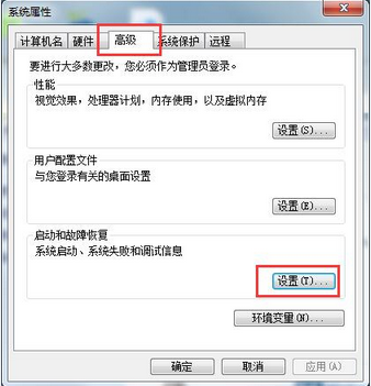 第三步:在出现的系统属性窗口直接选择高级选项,并点击启动和故障恢复的设置按钮。