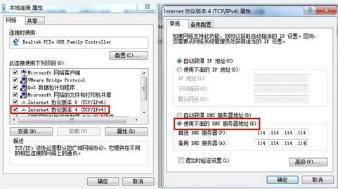 4、这个时候可以双击“Internet协议版本4(TCP/IPv4)”,并直接选择“使用下面的DNS服务器地址”,并把首选DNS服务器和备用DNS服务器设置为“114.114.114.114”。如下图: